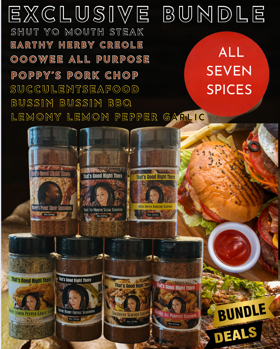 Ready to level up every meal? Get the full flavor experience with the That’s Good Right There Exclusive Bundle — featuring ALL SEVEN of our signature seasonings in one powerful pack: